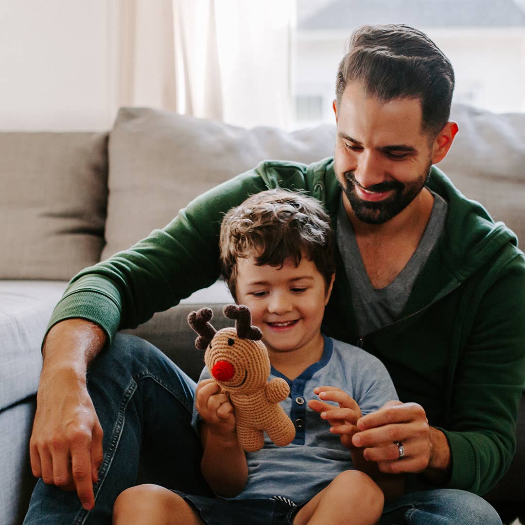 Add this irresistible Reindeer plush toy to your shop for the holidays. Rudolph's nose is red and he's all aglow, ready to lead the sleigh of Christmas toys. Handmade with cotton yarn, this crochet baby toy is sure to be a flying favorite. The rattle inside gives a soft sound when shaken. Perfect stocking stuffers or Christmas gift topper.